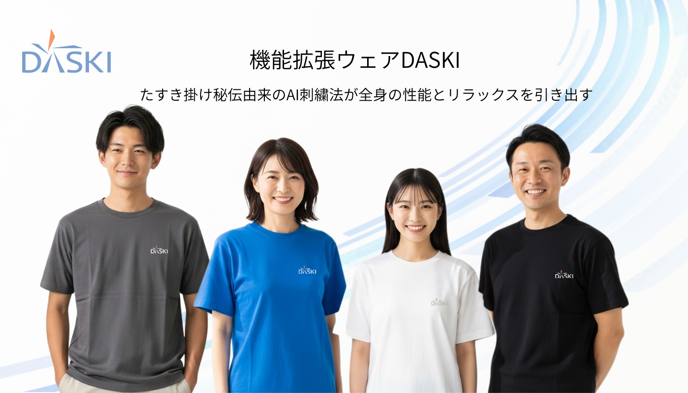 『DASKI』は、古来のたすき掛け秘術を最新のAI技術で解析し、計算・調整された5本の刺繍線のみで再現した、体温・柔軟性・パワー出力の全てが向上する機能拡張ウェアです。着たその瞬間から効果が出やすく、脱衣後10分経過しても平均70%の効果が持続します。